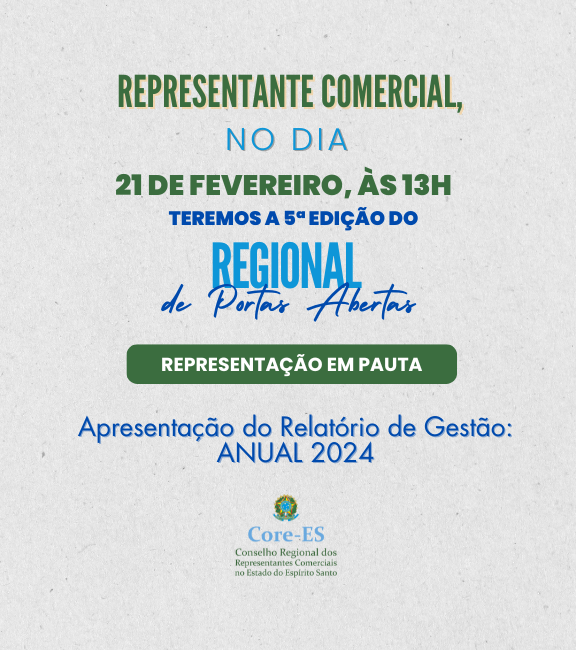 Com o objetivo de se aproximar ainda mais de seus registrados e manter a transparência, o Conselho Regional dos Representantes Comerciais do Estado do Espírito Santo (Core-ES) realiza a 5ª edição do “Regional de Portas Abertas - Representação em Pauta”, na sede do Conselho, no dia 21 de fevereiro, sexta-feira, a partir das 13 horas.