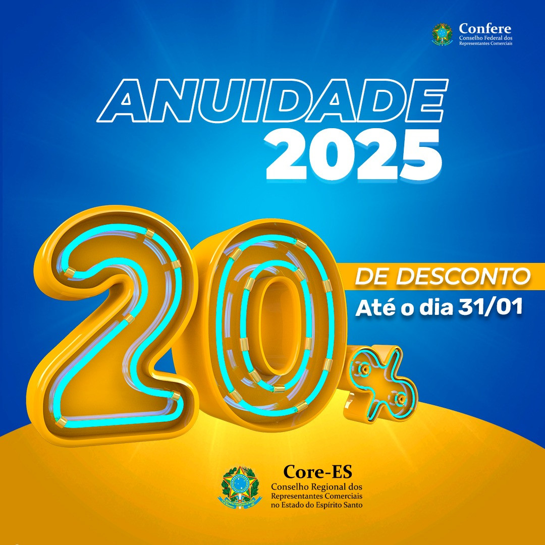 📢 Atenção, Representantes Comerciais!💡 Aproveite o desconto especial de 20% na anuidade de 2025!Para garantir esse benefício, basta realizar o pagamento até 31 de janeiro.💼 Valorize sua profissão e mantenha-se regular com condições imperdíveis. Não perca tempo!Acesse o site institucional do Core-ES ou envie e-mail para [email protected] para solicitar o boleto, caso ainda não o tenha recebido.