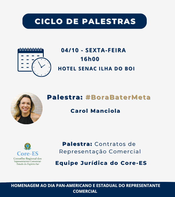 Também haverá a palestra “Contratos de Representação Comercial”, ministrada pela equipe jurídica do Core-ES.