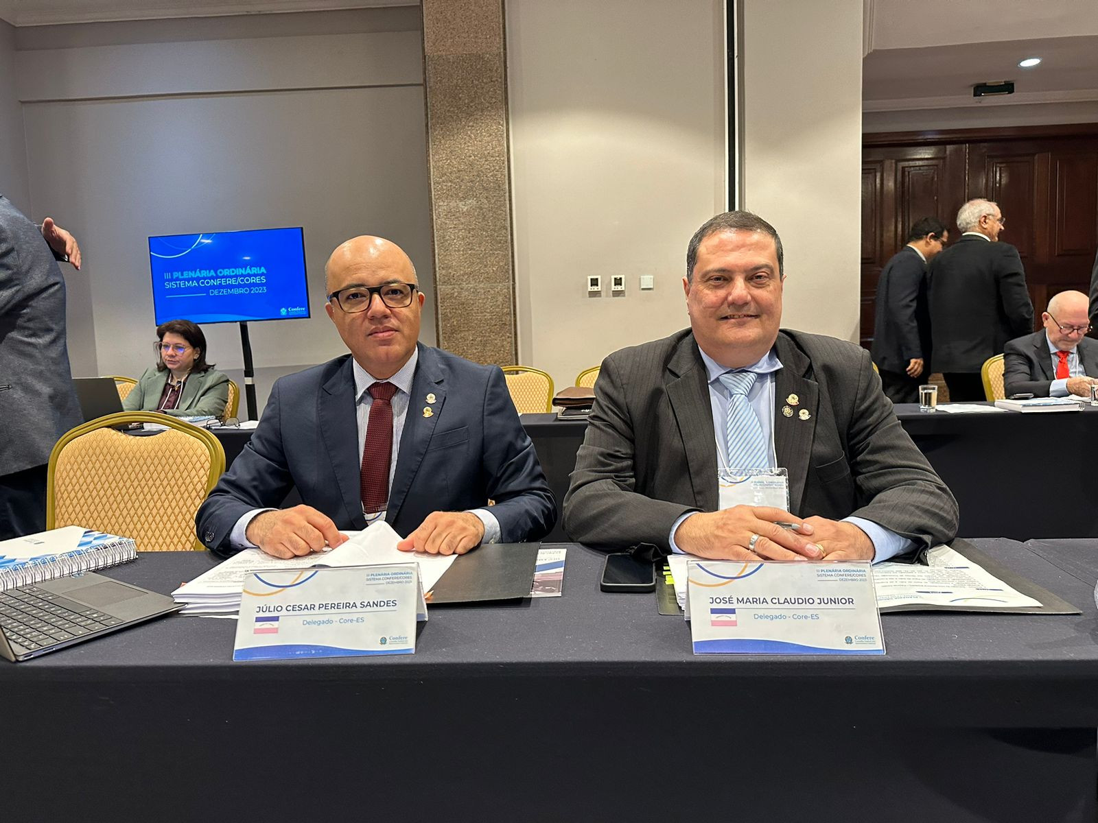 O Core-ES participa da III Reunião Plenária Ordinária de 2023, promovida pelo Confere, que aconteceu entre os dias 12 e 14 de dezembro. Dentre os itens de interesse da categoria, o encontro teve o objetivo de apresentar e aprovar o novo Plano de Ação e Proposta Orçamentária dos Conselhos Federal e Regionais para o exercício de 2024. O Conselho foi representado por Julio Cesar Sandes, diretor-secretário do Core-ES e por José Maria Claudio Junior e diretor-tesoureiro do Core-ES.