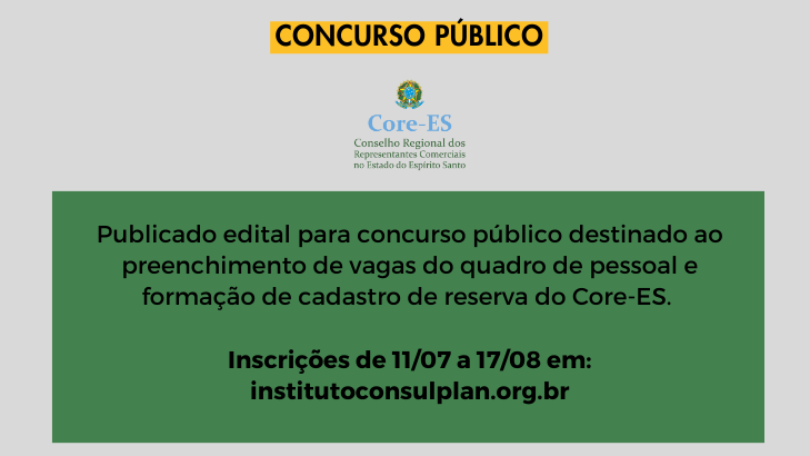 O Conselho Regional dos Representantes Comerciais do Espírito Santo (Core-ES) publicou nesta quinta-feira, 06, no Diário Oficial da União (DOU), o edital de concurso público destinado ao preenchimento de vagas de seu quadro de pessoal e formação de cadastro de reserva. São 08 vagas para início imediato e cadastro de reserva.