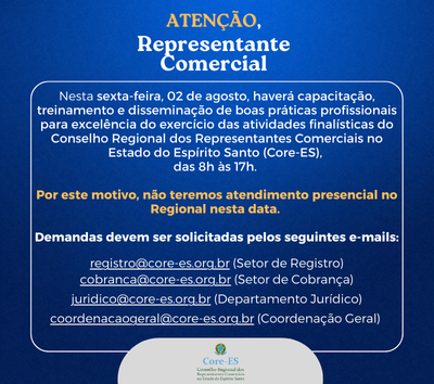 Nesta sexta-feira, 02 de agosto, haverá capacitação, treinamento e disseminação de boas práticas profissionais para excelência do exercício das atividades finalísticas do Conselho Regional dos Representantes Comerciais no Estado do Espírito Santo (Core-ES), das 8h às 17h. Por este motivo, não teremos atendimento presencial no Regional.