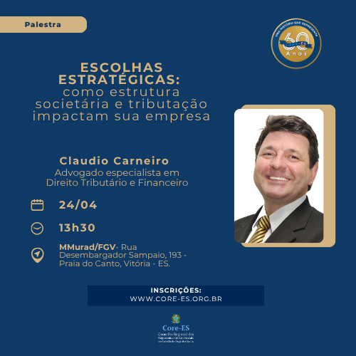 Dando continuidade à sua série de capacitações voltada aos registrados, o Core-ES promove a palestra “Escolhas Estratégicas: como a estrutura societária e a tributação impactam os resultados da sua empresa”. O encontro será ministrado pelo professor Claudio Carneiro, advogado especialista em Direito Tributário e Financeiro, no dia 24 de abril, a partir das 13h30, na MMurad/FGV, localizada na Praia do Canto, em Vitória.
